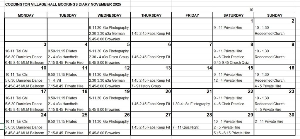 CODDINGTON VILLAGE HALL BOOKINGS DIARY